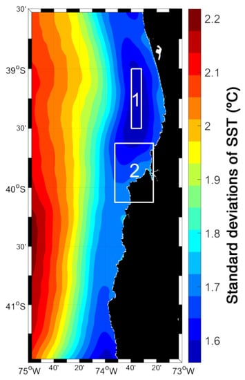 To evaluate upwelling, we conducted a preliminary analysis of the net surface heat flux (Qnet) and SST. Thus, when we analyzed seasonally the Qnet, we observed the highest values towards the coast (higher than 120 W m−2), during the austral spring–summer seasons (Figure 2a). A similar pattern was observed for Qnet for autumn–winter seasons but with values decreased by approximately 110 W m−2 (Figure 2b). According to this analysis, we should expect higher (lower) temperatures during spring–summer (autumn–winter) seasons, especially towards the coast. However, lower SST values were observed towards the coast during spring–summer seasons (Figure 2c). This would indicate that during spring–summer seasons there is an advective process that is cooling near the coast and that would be mainly due to the effect of upwelling. These characteristics must be observed when analyzing the spatial standard deviation of all the SST images (Figure 3). Thus, offshore we obtained the largest standard deviations congruent with the seasonal pattern of the Qnet. On the other hand, near the coast, we observed the smallest standard deviations owing to the seasonal pattern of the Qnet and the effect of the upwelling that diminishes the temperatures during spring–summer seasons (Figure 2c).