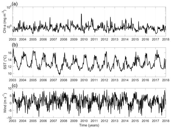 Evolutions of 8-day composite Chl-a, daily SST, and daily alongshore SSW close to Punta Galera are presented in Figure 4. In general, the Chl-a did not have a very clear seasonal signal, its values fluctuated mostly around 0.3 and 2 mg m−3, and its peaks were more evident during spring and summer (Figure 4a). In contrast, the SST showed a clear seasonal pattern owing to the variation of solar radiation. The highest temperatures occurred during the summer where they reached between 17 and 18 °C while the lowest temperatures were in winter where they oscillated between 11 and 12 °C except for 2007 where it dropped to values lower than 10 °C (Figure 4b). In addition, the SST presented many pulses of low temperatures during spring and summer most likely related to the coastal upwelling. Like the SST, alongshore SSW also exhibited a clear seasonal pattern, but with many pulses throughout the entire time series (Figure 5c). The winds were favorable to the upwelling during spring and summer and their higher values fluctuated between 5 and 9 m s−1 while they were favorable to the downwelling during the winter where their higher intensities ranged between 5 and 6 m s−1.