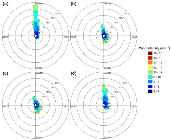 Frequency histogram of daily surface wind magnitude and direction for the study area: austral summer (a), autumn (b), winter (c), and spring (d).