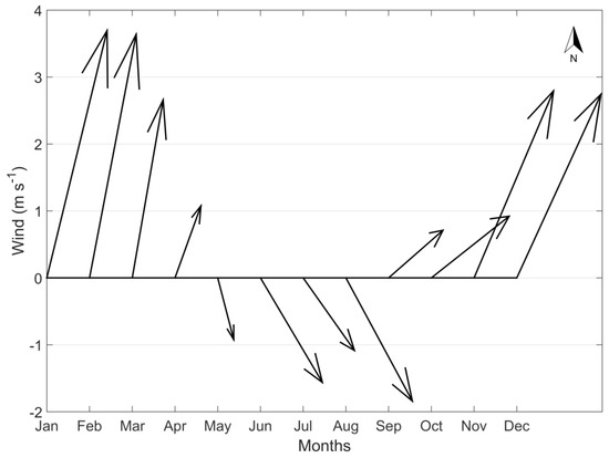 In order to evaluate the wind at Punta Galera, we obtained a stick plot of the long-term averages of the wind around ~40° S (Figure 7). Near Punta Galera, the wind seasonally came predominantly from the southwest between November and March with intensities that ranged between 3 and 4 m s−1. The months of April–May and September–October can be considered as transitional, where the wind intensity decreased between 1 and 1.5 m s−1 and had a weak meridional component. During the winter months (June–August), the winds intensified reaching values of 2 m s−1 but predominated from the northwest