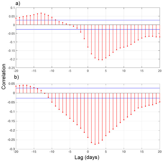 Cross-correlation between daily SST anomalies and daily alongshore SSW anomalies (a) and daily SST anomalies and daily Chl-a anomalies (b). SST and Chl-a correspond to north of the Punta Galera (~39.25° S, Figure 3, rectangle white 1) and alongshore SSW correspond to the area closest to Punta Galera (~40° S, Figure 3, rectangle white 2). The blue lines in (a,b) shows the upper and lower confidence bound (95% confidence level).