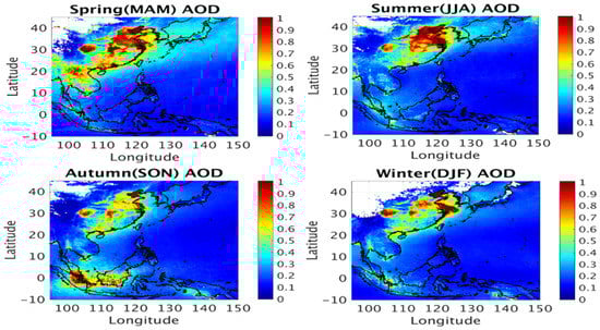 Spatial distribution of aerosol optical depth (AOD) from Aqua moderate-resolution imaging spectroradiometer (MODIS) for each season in East Asia 2005–2015.