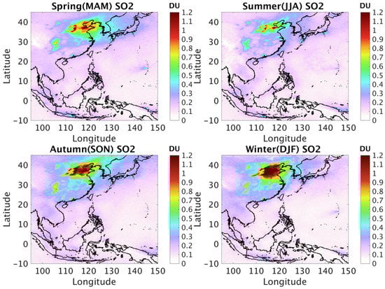 Spatial distribution of planetary boundary layer (PBL) sulfur dioxide (SO2) from Aura ozone monitoring instrument (OMI) for each season, 2005–2015. (Unit: Dobson units; 1DU= 2.69 ×1016 molecules cm−2)