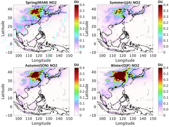 Because NO2 is mostly a result of vehicle emissions [7], hotspots of NO2 lie in highly urbanized areas such as Beijing, Shanghai, Guangzhou, Seoul, and Tokyo, as shown in Figure 4. NO2 is mainly anthropogenic in origin and NO2 levels over the ocean are low. The seasonal cycle of NO2 in China is the same as that of SO2, with the highest level in winter and the lowest level in summer, which is the result of the combination of emission source and the impact of meteorological fields.