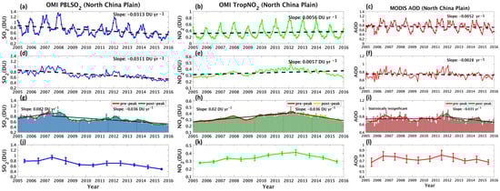 Long term trends of SO2, NO2, and AOD over the North China Plain. (a–c) original with overall trend line, (d–f) seasonally adjusted time series with overall trend line, (g–i) five-month moving average with pre-peak and post-peak trend lines and histogram for seasonally adjusted data, and (j–l) yearly mean time series.