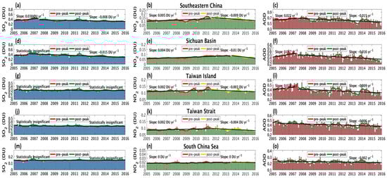 Five-month moving averaged seasonally adjusted time series of SO2, NO2, and AOD over (a–c) Southeastern China, (d–f) Sichuan Basin, (g–i) Taiwan Island, (j–l) Taiwan Strait, and (m–o) South China Sea. The pre-peak and post-peak trend lines are indicated by red and green lines, respectively, for SO2 and AOD, and are indicated by red and yellow lines, respectively, for NO2. Besides, the seasonally adjusted data are also shown by histogram.