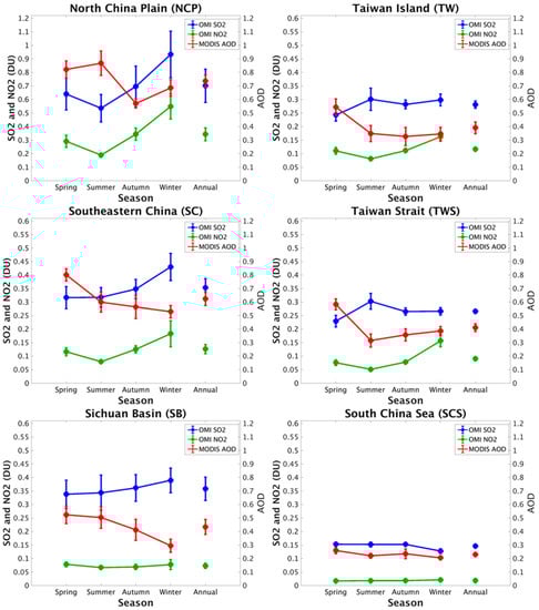 Seasonal cycle of SO2, NO2, and AOD for each monitoring region. The error bar indicates the standard deviation of each seasonal or annual mean. Note that the scale of SO2 and NO2 for the NCP is different from that for the other regions.