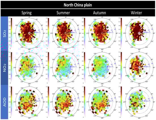 Summary of wind dependency of SO2, NO2, and AOD in North China Plain for each season. The shading color indicates the value of SO2, NO2, and AOD. The radial direction and radial distance represent the wind direction and wind speed at 850 mb, respectively.