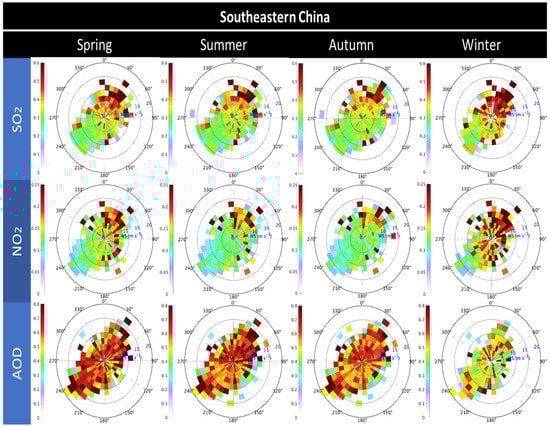 Summary of wind dependency of SO2, NO2, and AOD in Southeastern China for each season. The shading color indicates the value of SO2, NO2, and AOD. The radial direction and radial distance represent the wind direction and wind speed at 850 mb, respectively.