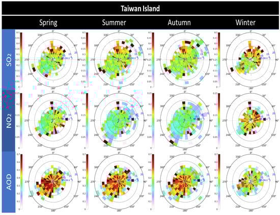 Summary of wind dependency of SO2, NO2, and AOD in Taiwan Island for each season. The shading color indicates the value of SO2, NO2, and AOD. The radial direction and radial distance represent the wind direction and wind speed at 850 mb, respectively.