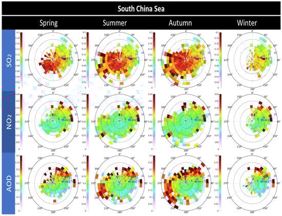 Summary of wind dependency of SO2, NO2, and AOD in South China Sea for each season. The shading color indicates the value of SO2, NO2, and AOD. The radial direction and radial distance represent the wind direction and wind speed at 850 mb, respectively.