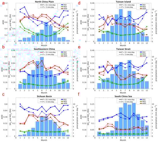 Seasonal cycles of SO2, NO2, and AOD with precipitation and without precipitation in (a) North China Plain, (b) Southeastern China, (c) Sichuan Basin, (d) Taiwan Island, (e) Taiwan Strait, and (f) South China Sea, respectively. Precipitation is indicated by P and the pollutant data (SO2, NO2, and AOD) with and without precipitation are presented by the dashed and solid line, respectively. The SO2, NO2, and AOD data are shown by the blue, green, and red line, respectively. The seasonal cycle of precipitation is illustrated by the histogram for each monitoring regions.