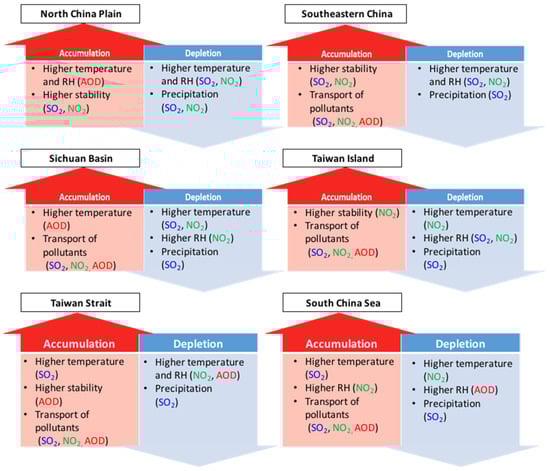 Summary of correlations between pollutants and meteorological conditions for six monitoring regions. When the effect of meteorological factor leads to the accumulation/depletion of pollutants, it is indicated by the red/blue arrow. Additionally, the effect of meteorological factor could be only significant on certain species of pollutant, which is shown within the brackets and is further highlighted by blue, red, and green color for SO2, NO2, AOD, respectively.