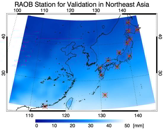 Radiosondes measure the state of the atmosphere at each altitude level and thus the radiosonde-derived water vapor content can be considered as true reference data. For the quantitative validation of the retrieved TPW, radiosonde observations (RAOB) from the University of Wyoming were used (Table 2). However, it should be noted that there might be uncertainty in RAOB, especially humidity profiles, depending on the type of the sensor used. Most sensors used in the study are located in Northeast Asia and have high biases compared to the humidity profiles from ECMWF []. Thus, only the data from 13 observation stations (Figure 1) located in Northeast Asia (mainly in Japan) having the same sensor types (i.e., Vaisala RS92 and Meisei RS-11G) with generally good accuracy are used to assess the retrieved TPW. These radiosonde data are available on the website from the University of Wyoming (http://weather.uwyo.edu/upperair/sounding.html).