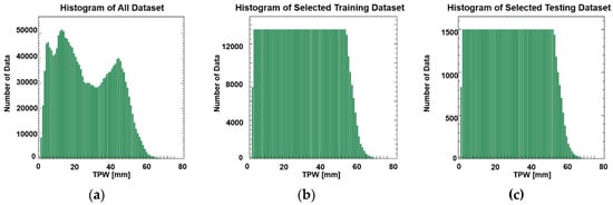 Histograms of training data for machine learning in Northeast Asia for two years (i.e., September 2016 to August 2018). The x-axis is the TPW range (0–80 mm) and the y-axis is histogram density. The bin size is 1 mm. (a) Histogram of all TPW during the period, (b) histogram of the selected TPW (13,500 datasets per bin size) for training, and (c) histogram of the selected TPW (1500 datasets per bin size) for testing.