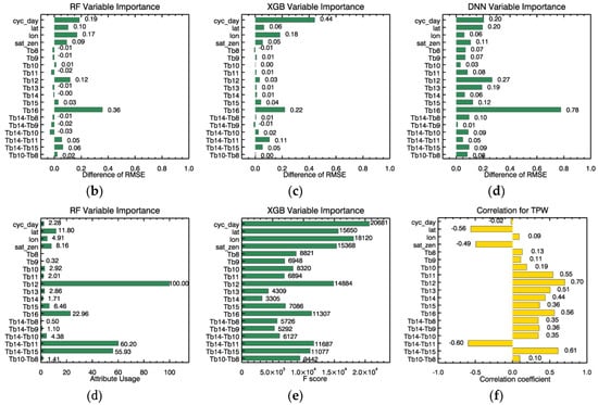 Relative variable importance identified by (a) RF, (b) XGB, and (c) DNN. Bar plots using input variables of the training dataset: the x-axis is the difference of root mean square error (RMSE) and the y-axis is the corresponding name of input variables. The difference in RMSE (the original RMSE − new RMSE) is calculated using the leave-one-variable-out method. The original RMSE of RF, XGB, and DNN are 2.63, 2.46, 2.69 mm, respectively. The variable importance is calculated after the construction of ensemble trees for the rule-based models (d) RF and (e) XGB. The longer the length of the bar is, the more important the variable is. (f) summarizes correlation coefficients between the input variables and TPW.
