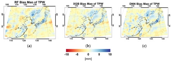 Figure 6a–c shows the summary of calculated variable importance results of the RF, XGB, and DNN. BT16 is identified as the most contributing variable to the retrieval of TPW in all models while the cyc_day and longitude are considered next significant in the RF and XGB and BT12, cyc_day, and latitude are considered next significant in the DNN. The BT16, which is a sensitive channel to carbon dioxide, is used for the estimation of mean tropospheric air temperature. The cyc_day reflects natural variations of TPW considering seasonal characteristics []. The longitude and latitude represent the spatial distribution of TPW. The BT12 is a channel sensitive to water vapor as well as ozone. Unlike the variable importance results identified in the DNN, some variables in the RF and XGB show improved accuracy when they are excluded (i.e., negative RMSE difference in Figure 6a,b). This implies that the variables might have redundant information and not be necessary for the RF and XGB to produce the best performance [].