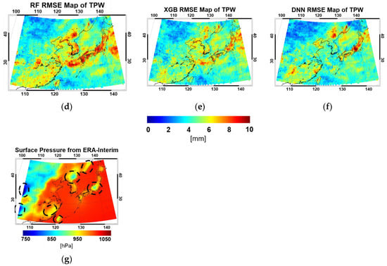 Mean error maps of TPW in Northeast Asia for two years (September 2016 to August 2018). The upper figures represent mean bias (ERA-Interim TPW – retrieved TPW) maps (a–c) and the lower figures represent mean RMSE maps (d–f). The left, middle, and right figures are the retrieved results from the RF, XGB, and DNN, respectively. (g) is the averaged surface pressures using ERA-Interim data from October 2016 to August 2018 in the study region. The black dotted circles indicate relatively lower surface pressures when compared to the surrounding areas.