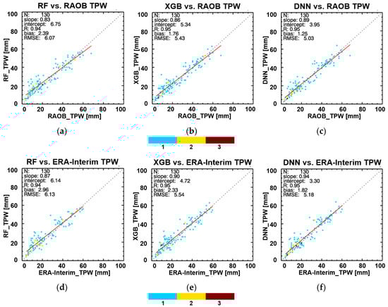Accuracy assessment results of the retrieved TPW from the DNN, RF, and XGB using RAOB (a–c) and ERA-Interim (d–f) in Northeast Asia (1st, 25th per month from September 2016 to August 2018). The retrieved TPW from each model and ERA-Interim TPW is collocated with the 13 RAOB stations over clear sky regions. Scatter plots are colored by density: the x-axis is the reference data (RAOB and ERA-Interim) and the y-axis is the retrieved TPW from each model. The red lines are the regression lines.
