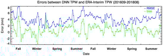 Figure 9 displays the time series of the averaged mean bias and RMSE between the retrieved TPW from the DNN model and ERA-Interim TPW per scene between October 2016 and August 2018 in the Northeast Asia area. The variabilities of the mean bias and RMSE are relatively high during the humid summer season, followed by fall and spring. On the other hand, both errors are relatively low and consistently stable during the dry winter season. This is because humidity errors are larger under moist conditions []. As described earlier, the study utilizes the criteria based on the single channel or dual-channel differences to detect clouds and they may not effectively discriminate snow from clouds, causing a low retrieval rate in the Northern Hemisphere winter []. The decreased retrieval rate can lead to relatively poor performance of the retrieval algorithm in winter.
