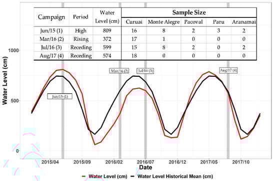 Besides the LGC floodplain, one can note the Paru Lake floodplains system, mainly influenced by the Amazon River flood pulse but less impacted by anthropogenic actions [82]. The floodplains systems Pacoval, Aramanai, and Monte Alegre, however, were influenced by both Amazon floodplains and the Tapajós River flood pulse in some hydrograph phases [83].