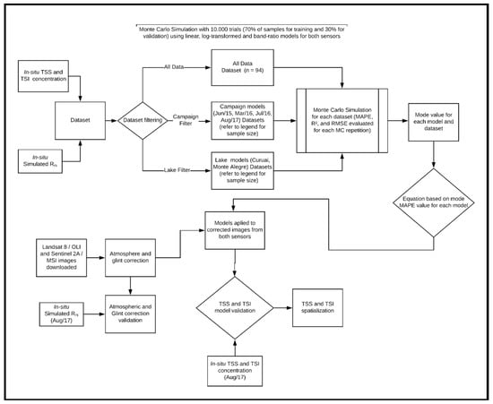 To address the objective, the research effort is described as follows: (i) The calibration and validation of empirical TSS and TSI algorithms through OLI- and MSI-simulated Rrs using a Monte Carlo Simulation; (ii) the validation of atmosphere and glint correction for OLI (6S, L8SR, and ACOLITE) and MSI (6S, ACOLITE, and Sen2Cor) using in situ Rrs; (iii) the validation of TSS and TSI models obtained through Monte Carlo simulation in corrected OLI and MSI imagery; (iv) the spatialization of TSS and TSI in the study area.