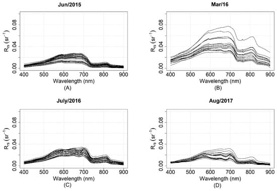 The Rrs in situ spectrum separated by field campaign: (A) For June 2015; (B) for March 2016; (C) for July 2016; and (D) for August 2017.