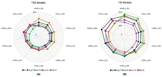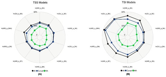 The Mean Absolute Percentage Error (MAPE) values (%) obtained through a Monte Carlo simulation for Rrs,sim_sat for both sensors using log models based on the Campaign Dataset: (A) the log models for TSS and (B) the log models for TSI. The validation sample size for each campaign: June 2015 n = 9; March 2016 n = 5; July 2016 n = 8; August 2017 n = 5. The R² and RMSE are in the Supplementary Files A. “All” at the bottom in the legend for TSS and TSI refers to the MAPE values for the All Dataset models (The values are in Table 3).