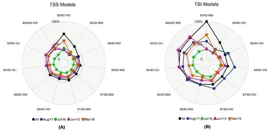 The MAPE values (%) obtained through a Monte Carlo simulation for Rrs,sim_sat for both sensors using band-ratio models based on the Campaign Dataset: (A) The band-ratio models for TSS and (B) the band-ratio models for TSI. The validation sample size for each campaign: June 2015 n = 9; March 2016 n = 5; July 2016 n = 8; and August 2017 n = 5. The R² and RMSE are in the Supplementary Files A. “All” at the bottom of the legend for TSS and TSI refers to MAPE values for the All Dataset models (The values are in Table 3).
