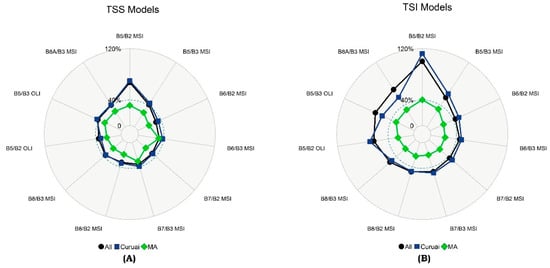 The MAPE values (%) obtained through a Monte Carlo simulation for Rrs,sim_sat for both sensors using band-ratio models based on the Lake Dataset: (A) the band-ratio models for TSS and (B) the band-ratio models for TSI. The validation sample size for each lake: Curuai = 20 and Monte Alegre = 5. The R² and RMSE are in the Supplementary Files B. “All” at the bottom of the legend for TSS and TSI refers to the MAPE values for the All Dataset models (The values are in Table 3).