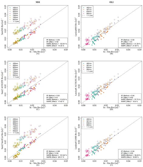 The atmosphere correction results before (empty circles) and after (fill circles) glint correction for both sensors (Point colors refer to sensor spectral bands—see the top-left box). The R² and MAPE values for the right-bottom box refers to the atmospheric correction results before and after glint correction for all VNIR bands. The left column refers to the MSI methods: 6S (A), ACOLITE (C), and Sen2Cor (E) and the right column refers to the OLI methods: 6S (B), ACOLITE (D), and L8SR (F).