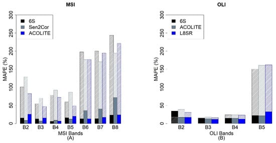 The MAPE values for the VNIR spectral bands of both MSI (A) and OLI (B) sensors: The hatched bars refer to the MAPE values before glint correction, and the solid bars refers to the MAPE values after glint correction for the three atmospheric correction methods for both sensors.