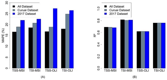 The barplots with MAPE (A) and R² (B) values for TSS and TSI estimates using All, Lake/ Curuai, and Campaign/17 Dataset Monte Carlo-calibrated models applied to both sensors imagery using equations from Table 6.
