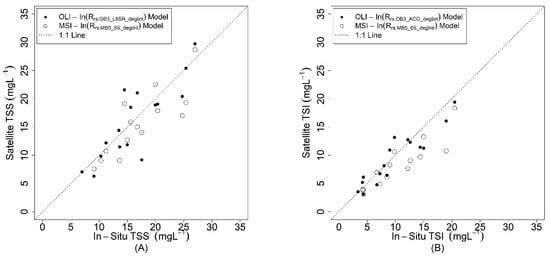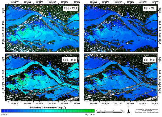 The best TSS and TSI models provided by the All Dataset were applied to OLI and MSI scenes and compared with models provided by the Campaign (August/17) Dataset and Lake (Curuai) Dataset to assess their performance. Therefore, the following models were applied to OLI images: ln (Rrs,OB3-L8SR-deglint) and ln (Rrs,OB3-ACO-deglint) for estimating TSS and TSI concentration, respectively. For MSI, the selected model was ln (Rrs,MB5-6S-deglint) for both variables (TSS and TSI) (Table 6). The results show that, for OLI images, the All Dataset models had the best performance for both TSS and TSI estimation. For the MSI images, however, Curai Lake Dataset had the best performance, whereas, for TSI, the best performance was provided by the All Dataset (Figure 11).