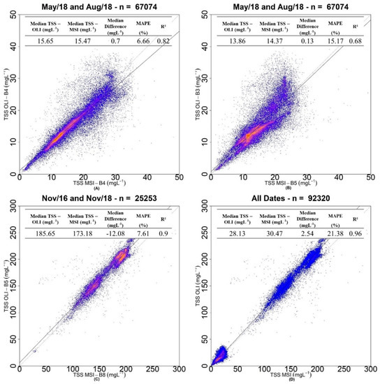 A comparison between the cloud-free images acquired at concurrent overpasses of both sensors were corrected for atmospheric effects using 6S and also by glint effects. Then, TSS-calibrated algorithms were applied to the corrected images to assess the congruence of the TSS estimates [99]. A search for matchups at Curuai Lake from 2015 to 2019 resulted in two scenes for the low-water season (Nov/11/16 and Nov/01/2018), one for the high-water season (May/25/2018) and one for the receding season (Aug/13/2018). Randomly selected 100,000 samples were used to compute Rrs for both sensors. These Rrs were first used to compute the Modified Normalized Water Index [100] (MNDWI: (Rrs,green − Rrs,SWIR)/(Rrs,green + Rrs,SWIR)), setting a threshold of 0.3 to build a water mask. Besides the statistical indexes MAPE and R², the median difference (MD) between OLI and MSI TSS retrievals was also calculated using OLI as a reference [47].