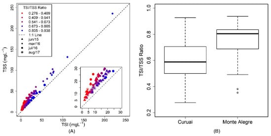 The limnological dataset used in this study (TSS, TSI, TSO, and Chlorophyll-a (Chl-a)) were collected during four field campaigns carried out between 2015 and 2017 (Figure 2), sponsored by the project MAS-BNDES 1022114003005. The TSS, TSI, and TSO quantifications followed Wetzel and Likens [84], using a Whatman GF/C (1.2 µm) glass fiber filter for filtration. Chl-a concentration determination followed Nush [85], using a Whatman GF/F (0.7 µm) glass fiber filter for filtration. Both the TSS and Chl-a concentrations were measured in duplicate, giving a concentration value as a simple mean of the duplicates.
