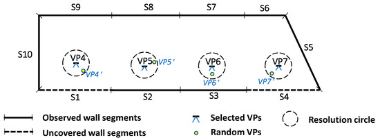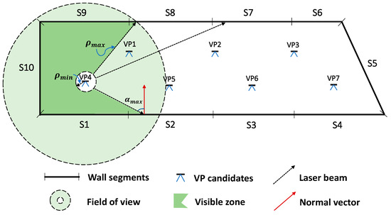 As mentioned, the observation quality of the scanners will be impacted by the range and the incidence angle. Thus, the lower and upper limits for range are defined according to the capability of the scanner, while the limit for incidence angle is set as 60° based on the research reviewed in Section 2.1. With these constraints, one can obtain the visible zone for each VP candidate. Taking VP4 in Figure 1 as an example, the field of view is the light green shaded ring defined by two concentric circles with the radius of and . With the incidence angle constraint, the dark green shaded area is defined as the visible zone for VP4. The visibility of each wall segment is evaluated by whether it completely falls into the VP candidate’s visible zone with no obstacles occluding the laser ray. Some of the segments are partially visible, e.g., S2 and S8, while some of them are out of the range capacity, e.g., S7. Thus, only S1, S9, and S10 are visible from VP4.