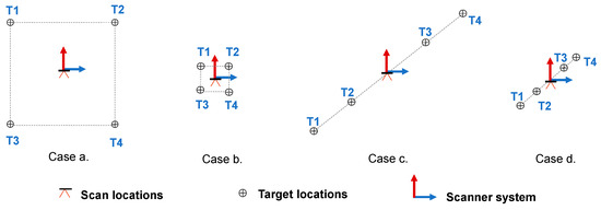 Among the target placement, at least four targets were observed from each scan, with an optimal geometry described in Section 4.1. In our method, the attribution of each selected target location is provided, indicating which four (or more than four) target locations are necessary for each scan. This means the users need to prepare only a few targets to accomplish the entire scanning project.