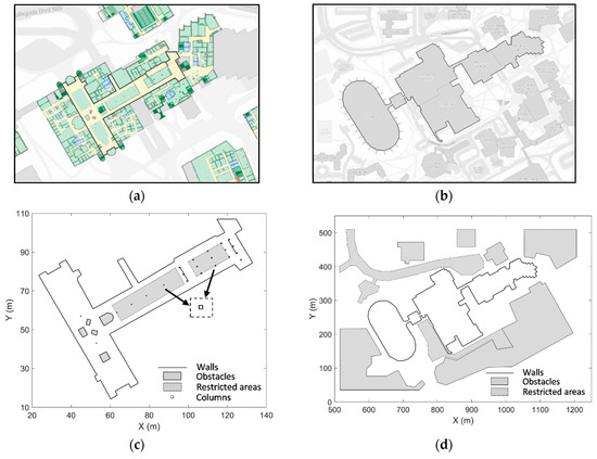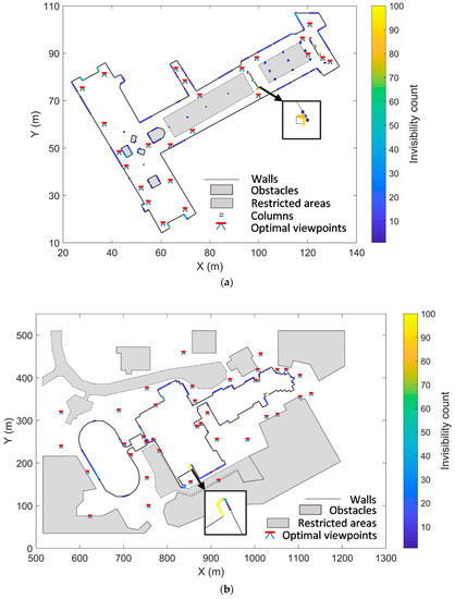 One can see some areas with the higher invisibility count in both figures, as shown in the enlarged images, which are due to different reasons. For the MacEwan Student Centre case, as introduced, the columns are considered fully covered if more than two faces of the square model are scanned. In Figure 10a, two faces of the column are invisible due to the obstacle of the interior wall connected to it. For the Oval-MacEwan Complex dataset, the existence of invisible parts is because of the missing of viewpoints in the narrow area, as discussed in Section 6.2.2.