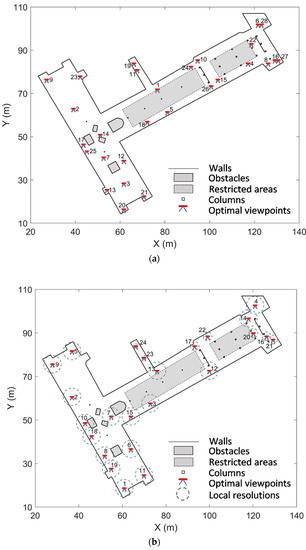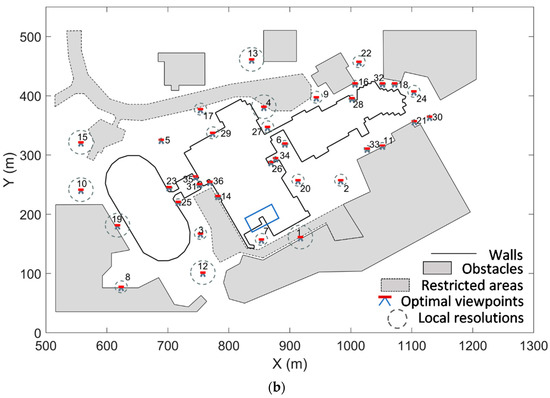 The scanner placement for the Oval-MacEwan complex dataset is illustrated in Figure 7. For results from Pipeline 1, 38 optimal locations were selected from 25268 VP candidates at the resolution of 2 m, with the 100% coverage of the object. In Figure 7b, 36 viewpoints were selected from Pipeline 2, with the resolutions increasing from 20 m to 0.035 m. The coverage rate of the object is 99%, and the missing area is at the corner near to VP7. The reason for the incomplete coverage is the lack of viewpoints, since no VP candidates are created in this narrow space. This is a limitation of the hierarchical method, that the initial resolution should be selected carefully otherwise certain areas would not be observed from any of the VP candidates. The missing part of the object is shown in the sensitivity tests in Section 6.4, where the users can manually add extra scans to complete the object coverage.