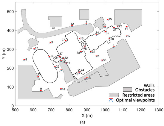 In this example, the viewpoint planning problem is to find the set of the minimum number of VP candidates that can cover the maximum set of wall segments. Known as the set-covering problem, this type of problem is a NP-complete problem [46,47]. In the theory of computational complexity, the optimal solution of NP-complete problem can be found by the extensive “brute force” search. For any of the known methods, the computational complexity in searching the optimal solution increases rapidly with the size of the problem. The idea of the standard greedy algorithm (GA) [48] is used in this paper due to its high efficiency in providing a near-optimal solution with the computational complexity of . Some heuristic optimization methods, such as the simulated annealing, the genetic algorithm, and the particle swarm optimization were compared with the greedy algorithm in [42], which proves that the optimality of their solutions improves along with the increased computations, as they perform like the accelerated intensive search strategy. Due to the above reasons, if the greedy algorithm can be improved to provide a solution with a smaller number of viewpoints, one can take its advantage in finding the solution with higher efficiency. The standard greedy algorithm and our proposed weighted greedy algorithm are introduced and their performance on the example are compared in this section.
