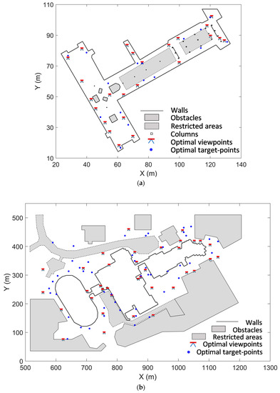 Using the method introduced in Section 4, the target placement was determined. For the MacEwan Student Centre dataset, target-point candidates were created with the uniform resolution of 1 m, while for the Oval-MacEwan Complex dataset, the step length was 2 m. The visibilities between the target-point locations and optimal VPs were tested based on the scanning geometry, with the minimum range of 2 m and the maximum range of 100 m. The target placement for the two datasets are illustrated in Figure 8. Sixteen target-point locations were finally selected for the MacEwan Student Centre case in Figure 8a, while 49 target-point locations were required for the Oval-MacEwan Complex case in Figure 8b. The program finished in 12 s and 41 s for the MacEwan Student Centre and the Oval-MacEwan Complex datasets, respectively, when 3000 iterations were set to determine the benchmark geometry.