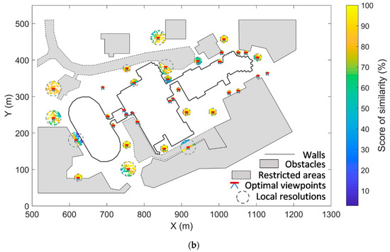 The solutions from two pipelines are illustrated in Figure 6. Figure 6a shows the solution from Pipeline 1, for which the VP candidates were constructed globally with the uniform resolution of 1 m. The solution comprises 28 VPs selected from 855 VP candidates. In Figure 6b, 24 VPs were selected from our proposed Pipeline 2, with four VPs less than the Pipeline 1 solution and a complete object coverage. Each optimal VP is circled with the radius of the resolution when this VP is labelled as a distinguishable VP. One can tell how the hierarchical progress works from the various radii. In this dataset, the construction of VP candidates started with the initial resolution of 4 m. Several of the VPs were labelled as indistinguishable VPs, e.g., VP17 and VP21, the resolution for these local areas was increased to 2 m, while VPs like VP1, VP5, and VP12, were saved as distinguishable VPs under the resolution of 4 m. Finally, the progress ended at the finest local resolution of 1 m, where VP23 and VP24 were selected as the last two distinguishable VPs.