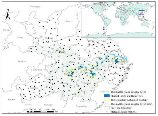 Hydrological map of the middle–lower Yangtze River basin (gray-green shaded area) and the spatial distribution of the studied lakes and reservoirs. The black triangles mark the locations of the meteorological stations, where ground-based measurements of temperature were used to produce the annual temperature map. The location of the middle–lower Yangtze River basin in China is shown in the inset.