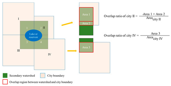 The population, fertilizer consumption, PGDP, SGDP, and TGDP of the surrounding cities were used to quantify the impact of anthropogenic activities on cyanobacterial bloom. Besides, the regions in which secondary watershed boundaries overlapped with a lake or reservoir were regarded as the watershed of the lake or the reservoir. Considering the different impact ratios of surrounding cities due to the different distribution areas of lakes and reservoirs in cities, we calculated the overlap ratio of the watershed of the lake or reservoir with the surrounding cities. The computational method is shown in Figure 3. The ratio in individual cities was regarded as the impact ratio of anthropogenic activities from that city, and then the sum of the surrounding cities represented the population, fertilizer consumption, PGDP, SGDP, and TGDP for lakes and reservoirs.