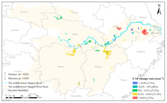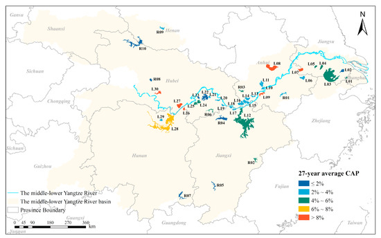 The changing trends of interannual CAP for each lake and reservoir from 1990 to 2016 (Figure 6 and Figure 7) and the change rates for all the lakes and reservoirs with spatial distributions are displayed by color shading in Figure 8. When the CAP change rates were classified into five levels (≤−0.4% year−1, −0.4% to 0% year−1, 0–0.1% year−1, 0.1–0.4% year−1, and >0.4% year−1), the corresponding proportions of each level were 7.5%, 20%, 27.5%, 37.5%, and 7.5% of the studied lakes and reservoirs, respectively. The CAPs for about 63% of the lakes (19/30) and all reservoirs showed increasing trends, and the most pronounced increase was observed in Chaohu Lake (L05, with a change rate of 0.57% year−1), while the greatest decrease was found in Shengjin Lake (L09, with a change rate of −1.04% year−1). Three lakes and one reservoir showed statistically significant increasing trends, while four lakes had CAPs that decreased significantly during the study period.