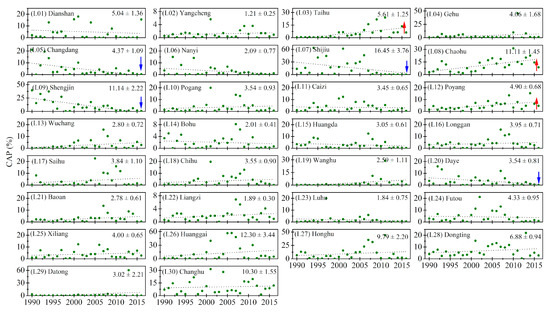 The interannual changes in the yearly cyanobacterial bloom area percentage (CAP) values for each studied lake ((L01)–(L30)). The red and blue arrows indicate the lakes with significant (p < 0.05) increasing or decreasing trends in CAP values over 27 years. The number in the upper right corners represent the 27-year average CAP and the standard deviations.