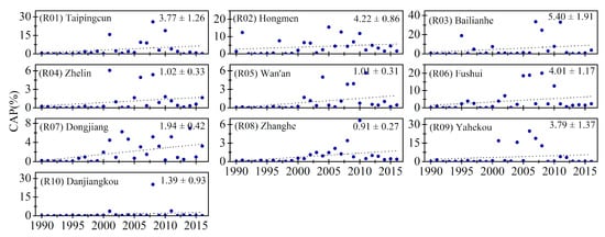 The interannual changes in the yearly cyanobacterial bloom area percentage (CAP) values for each studied reservoir ((R01)–(R10)). The number in the upper right corners represent the 27-year average CAP and the standard deviations.