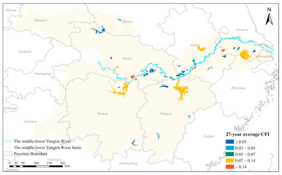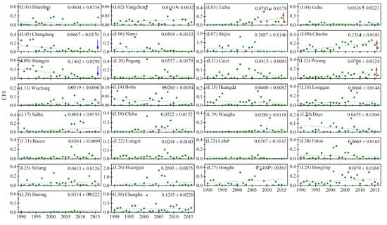 The 27-year mean CFIs of each lake and reservoir are presented in Figure 9. Specifically, the climatological CFI of lakes varied from 0.015 (Yangcheng Lake) to 0.389 (Shijiu Lake), and that of reservoirs ranged from 0.011 (Wan’an Reservoir) to 0.071 (Fushui Reservoir) during the study period (Figure 9, Figure 10 and Figure 11). In general, of the 30 lakes, only 16.7% had a 27-year mean CFI value of ≤0.03; 20% were between 0.03 and 0.05; 30% ranged from 0.05 to 0.07; 20% were between 0.07 and 0.14; and 13.3% were >0.14. Of the 10 reservoirs, 50%, 30%, 10% and 10% had values in the previously mentioned five levels, respectively.