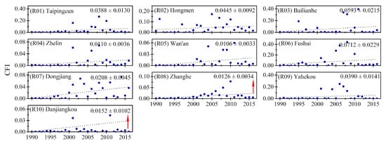 The interannual changes in the yearly cyanobacterial bloom frequency index (CFI) values for each studied reservoir ((R01)–(R10)). The red arrows indicate the lakes with significant (p < 0.05) increasing trends in CFI values over 27 years. The number in the upper right corners represent the 27-year average CFI and the standard deviations.